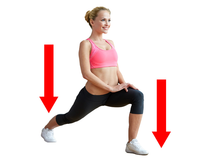 - Step forward with your left leg and drop your weight down so you literally place it on your right foot. Keep your right toes on the floor.