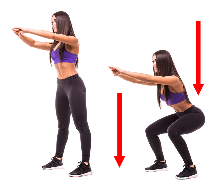 - Slowly bend your knees and lower down on your legs like you’re going to sit in a chair. Your upper body should stay straight.