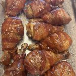 Hold the drumsticks with the bigger side up while you are holding the thinner end. Start wrapping the bacon around the fatter end slightly over lap the first line to secure the bacon then when you get to the thinner part tuck in the end of the bacon.