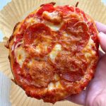 These pizzas could not be simpler to make. Place a naan bread in an air fryer paper liner. Top it with sauce and sprinkle it with cheese. Top it with pepperoni or your favorite pizza toppings. Sprinkle a little more cheese on top. And then air fry the pizza, in the paper liner. 375 degrees F for 6 – 8 minutes.