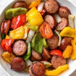 - Add the sliced sausage, chopped peppers and chopped onions into a large bowl. Add the seasonings and oil into the bowl and use tongs or two large spoons to toss everything together until the sausage and peppers are coated evenly