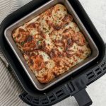 Step 7: Air fry at 320 for 35 minutes covered. Remove the foil and air fry at 300 degrees for another 20-25 minutes uncovered, checking occasionally to ensure the top isn’t browning too quickly. Tent loosely with foil if needed. Let stand 5-10 minutes before serving.