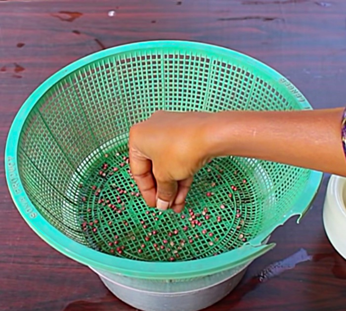 First, you will soak your coriander (cilantro) seeds in water for several hours, then you will drain them and crack then slightly with a mortar and pestle. Once the seeds are slightly cracked, place them in the colander with a bowl of water underneath and cover with a wet paper towel for a couple of days. Then you will remove the paper towel and just let your cilantro grow, topping up your base water from time to time.