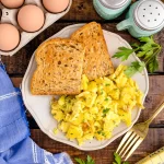 Have you tried cooking Scrambled Eggs in the Air Fryer? We all know the struggle of timing the perfectly cooked bacon, eggs, and toast breakfast! Remove the struggle by cooking your eggs in your air fryer, so your hands are free to butter toast! Air fryer scrambled eggs are healthy, delicious, and super simple to make, plus you can add cheese or veggies, just like on the stovetop.